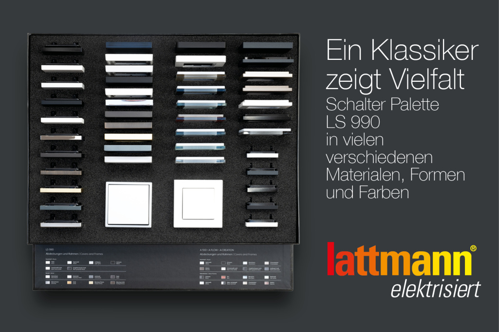 LS 990 Schalter Palette. Schauen sie sich jetzt die unglaubliche Vielfalt an Materialien, Formen und Farben dieses Bauhaus-Klassikers bei uns an. Jetzt auch in den Les Couleurs® Le Corbusier Farben! Lattmann elektrisiert